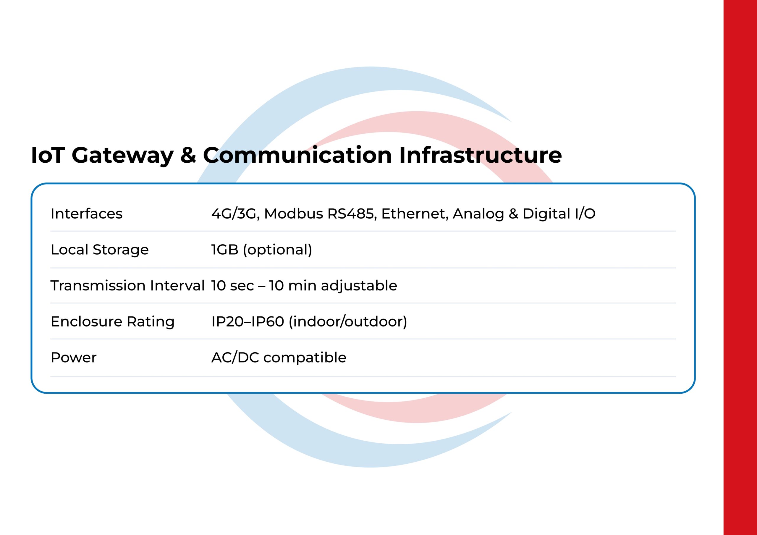 The IoT Gateway RTU-100 is a compact and reliable industrial gateway designed for smart monitoring and automation. Featuring multiple digital, analog, and relay inputs/outputs, it supports a wide range of sensors for flow, pressure, temperature, vibration, and water quality monitoring. With flexible connectivity options including Ethernet, RS485 Modbus, and 4G/3G, along with rugged performance from −20°C to 60°C, the RTU-100 ensures seamless data acquisition and control in demanding industrial environments