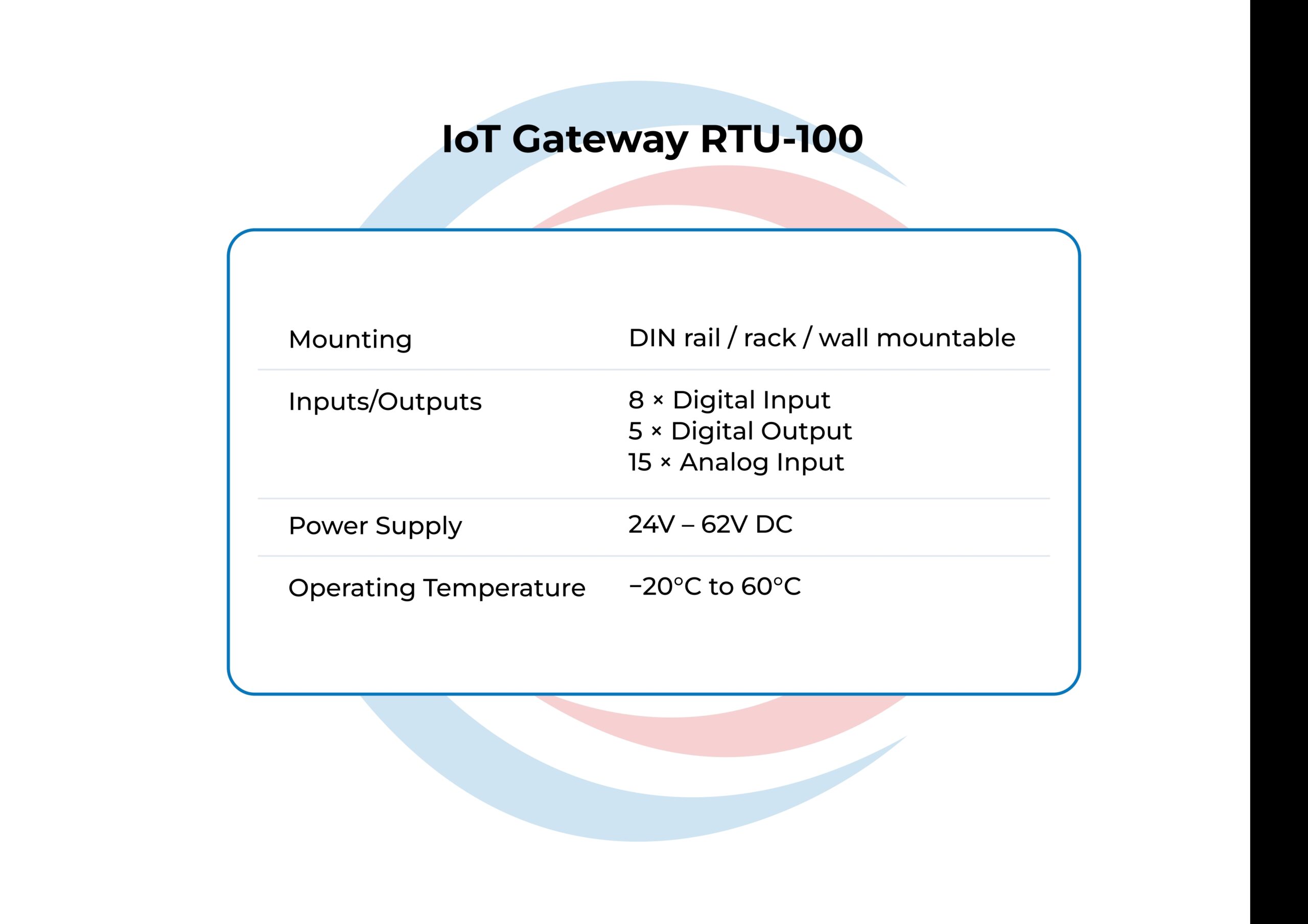 The IoT Gateway RTU-100 is a compact and reliable industrial gateway designed for smart monitoring and automation. Featuring multiple digital, analog, and relay inputs/outputs, it supports a wide range of sensors for flow, pressure, temperature, vibration, and water quality monitoring. With flexible connectivity options including Ethernet, RS485 Modbus, and 4G/3G, along with rugged performance from −20°C to 60°C, the RTU-100 ensures seamless data acquisition and control in demanding industrial environments